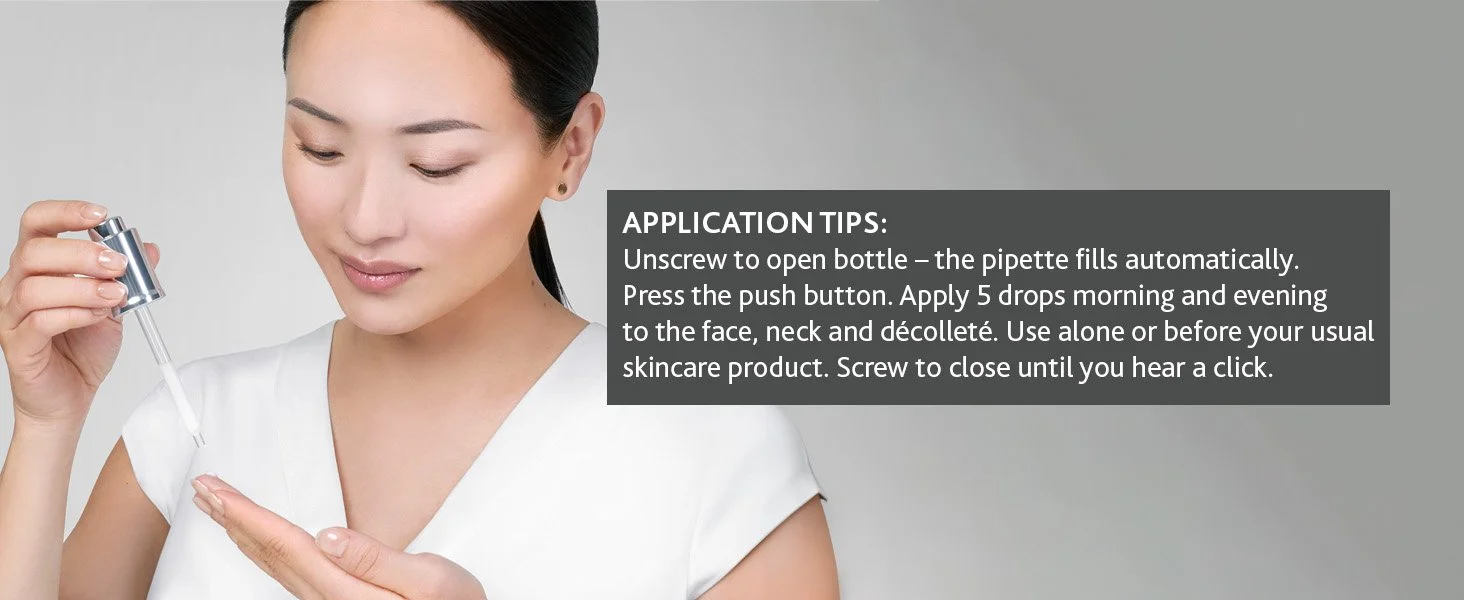Unscrew bottle, pipette fills. Apply 5 drops on face, neck, décolleté, alone or under cream. Screw until it clicks shut.